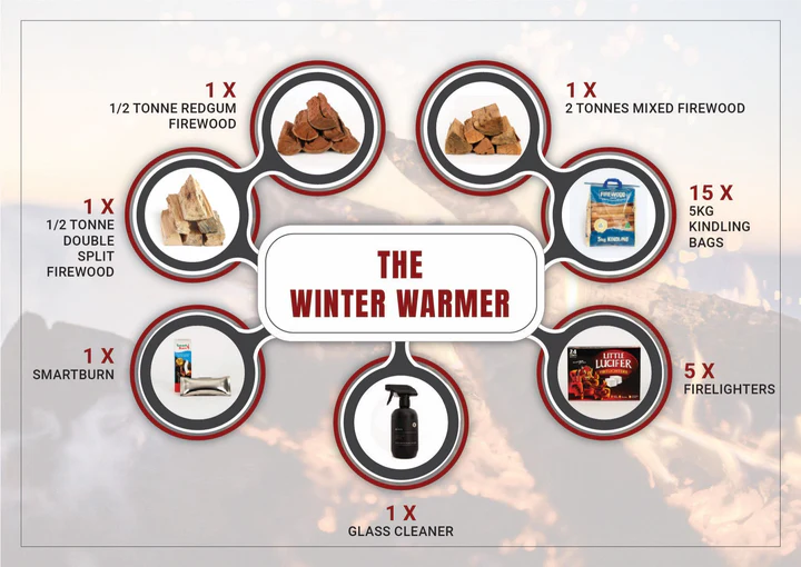 This The Winter Warmer pack includes: 1/2 tonne Redgum Firewood, 2 tonnes of Australian Hardwood, 1/2 tonne of Double Split Australian Hardwood, 15 x 5kg Kindling Bags.